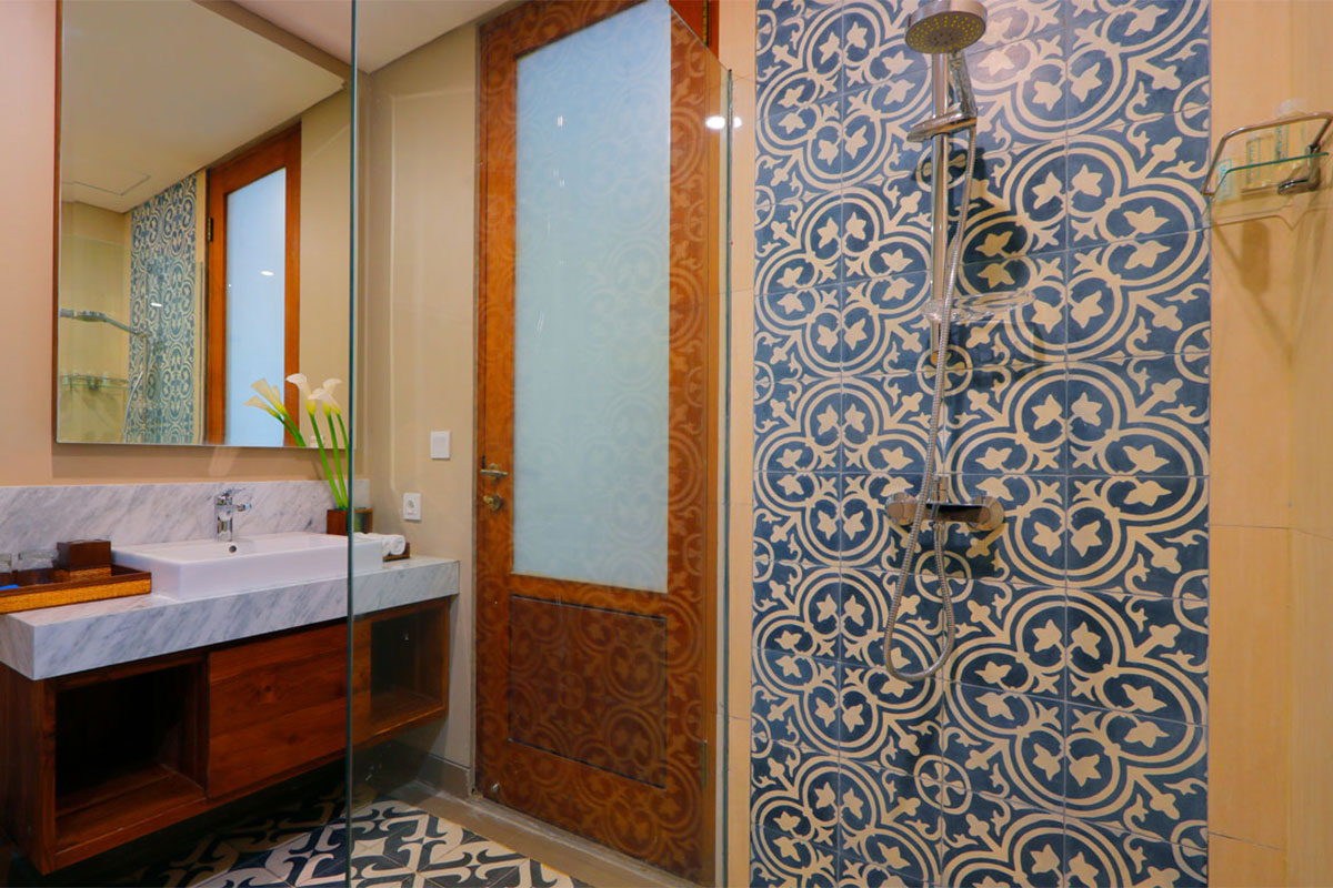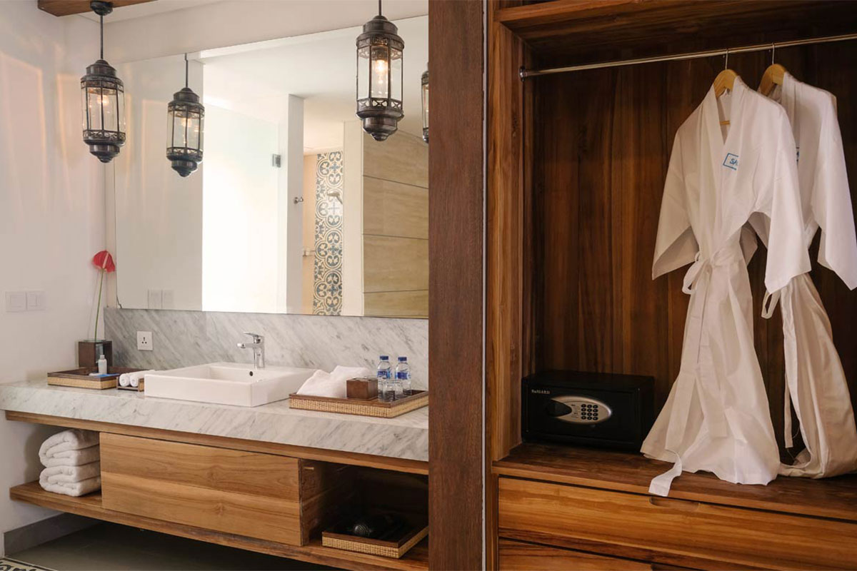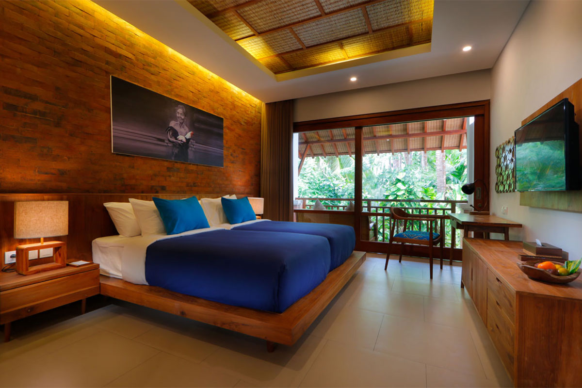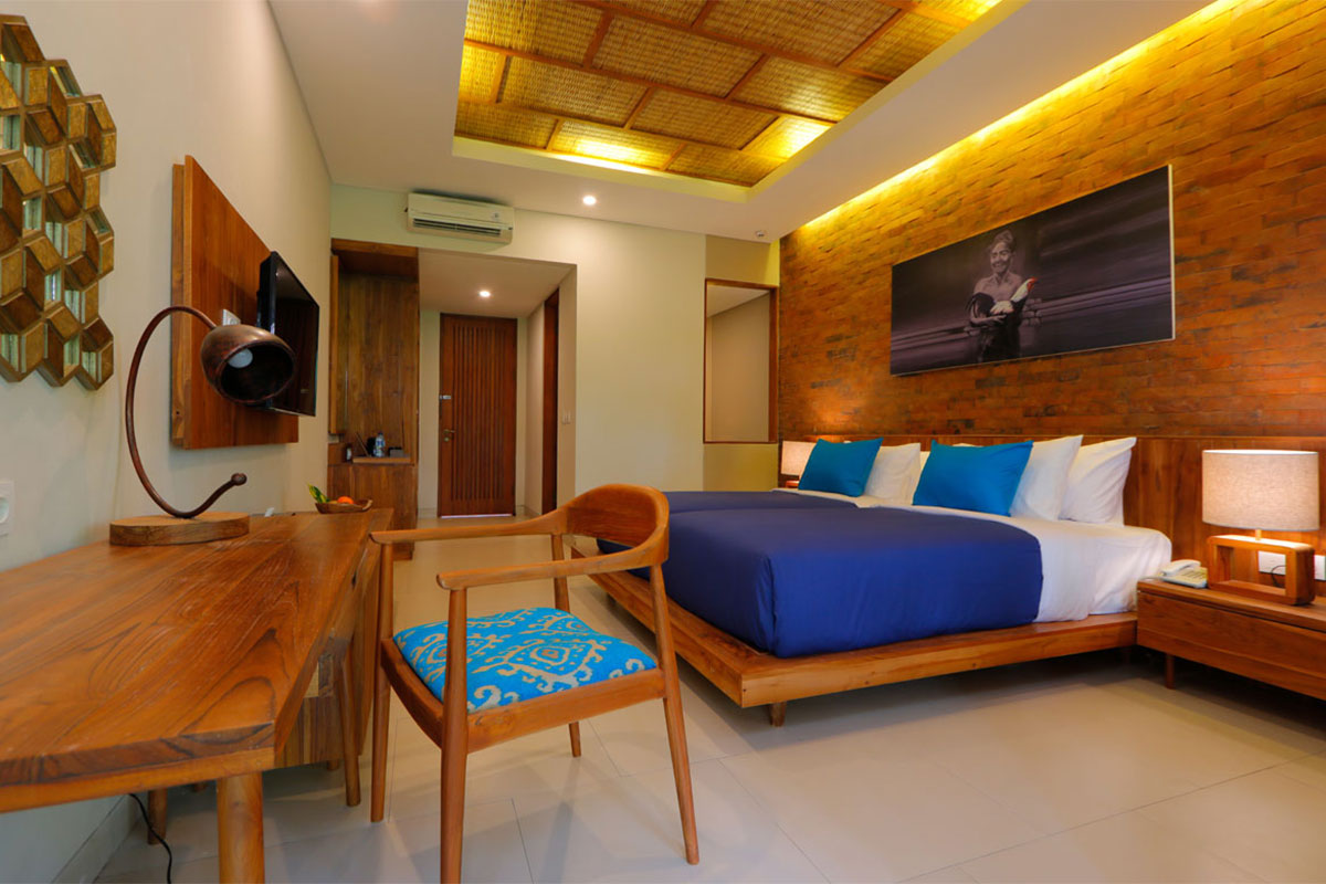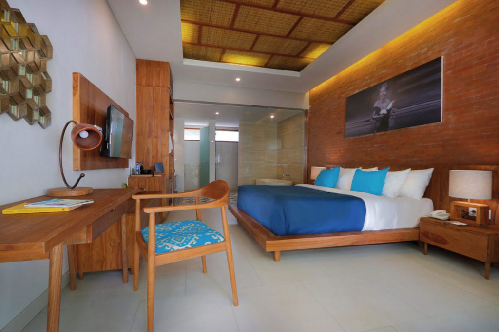 Located on the second floor, this stylish room category is a restful space that extends out onto a private balcony cooled by the sea breeze. Contemporary timber furnishings balanced by a classic brick feature wall and the subtle use of colour reflects Bali’s warm and welcoming appeal. The en-suite bathroom comes complete with a shower cubicle and a well-lit vanity.